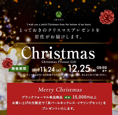 フォーマルバッグの製造を手掛ける株式会社 岩佐(大阪府大阪市中央区日本橋2−14−4 代表取締役社長:岩佐浩司)は、公式オンラインショップにてクリスマスキャンペーンを、2020年11月24日から12月25日まで実施致します。