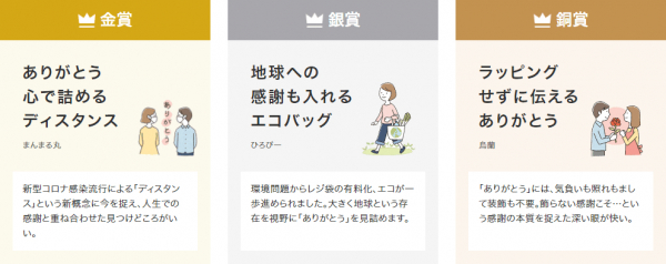 今回の川柳公募は、7万を越える「ありがとう」に出逢うことができ、選者として嬉しく思いました。これらの川柳をよむことによってコロナ下の制約を強いられる生活の中で、少しでも明るく前向きになれることを祈りつつ、時代の中の「ありがとう」を選ばせていただけたこと、感謝申し上げます。