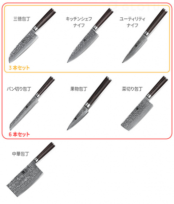 ・果物包丁、ユーティリティナイフ、三徳包丁、パン切り包丁、キッチンシェフナイフ、菜切り包丁