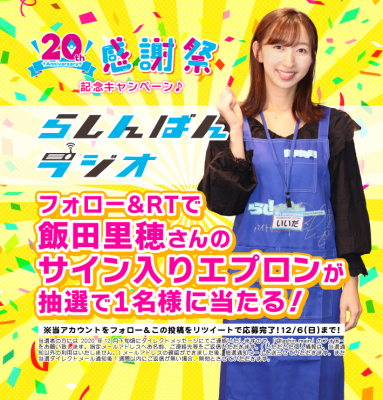 12月1日から放送開始 声優・アーティスト飯田里穂のらしんばんラジオ直前記念リツイートキャンペーン