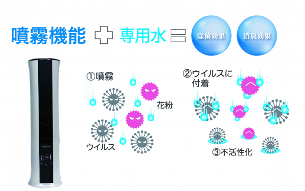 Air Force DEMIから発生する除菌ドライミストを室内の隅々まで行き渡らせ、空間を浮遊しているチリやホコリに付着した菌やウィルス、花粉と接触することで不活性化させます。