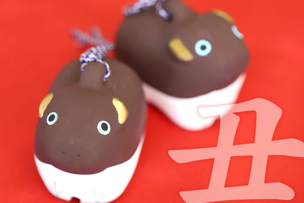 土鈴とは、粘土を焼成して作られた土製(やきもの)の鈴。その起源は古く、縄文時代の遺跡や古代の祭祀遺跡からも発見されています。昔から日本人の暮らしの中にあるお守りのような存在です。丑の愛嬌のある顔、やさしい鈴の音に笑みがこぼれます。かわいらしい丸いフォルムには思わず手を伸ばしてしまいます。