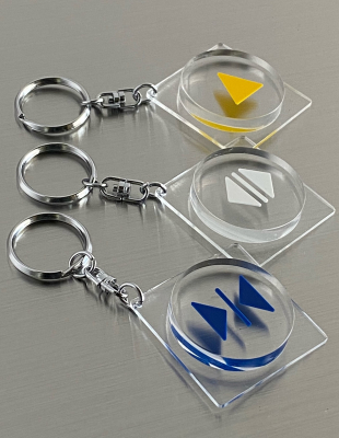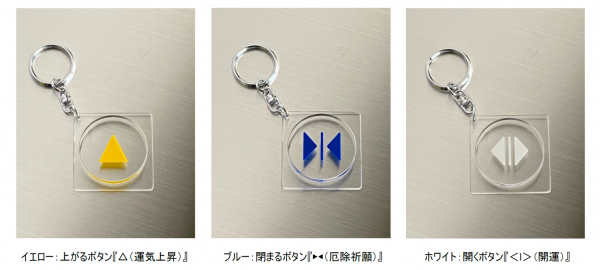 当キーホルダーは、当社が製造する本物のエレベーターボタンを使用しています。今年新たに採用したマークは、『>l<(厄除祈願)』。新型コロナウイルスをはじめとする厄除けにエレベーターの閉まるボタンを採用しました。上にあがるボタン『△(運気上昇)』と、ドアを開くボタン『<l>(開運)』の3種類です。デザインには、透明色のアクリルにホワイト、ブルー、イエローを採用。本アイテムは、当社が常にお参りしている氏神神社でのご祈祷済みです。受験生にはもちろん、2021年の運気アップにもおすすめのアイテムです。