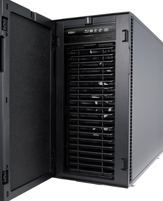 3.5インチ/2.5インチ両用ベイに6台のHDD/SSDと2.5インチSSD専用ベイに2台までのドライブが実装可能で、フロント-ドアは左右両方向に開閉可能です。
