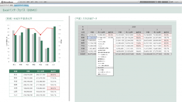 具体的には、Excelインターフェイスオプションにより、「MotionBoard Cloud」の各種チャートからExcelを開き、Excel上でデータの集計や分析が可能です。データソースの更新もおこなうことができ、予算やマスタなど、データの入力や修正が必要な際は、Excel上から作業できます。加えて、ExcelでのOLAP分析もできるため、より詳細なデータ分析ができます。