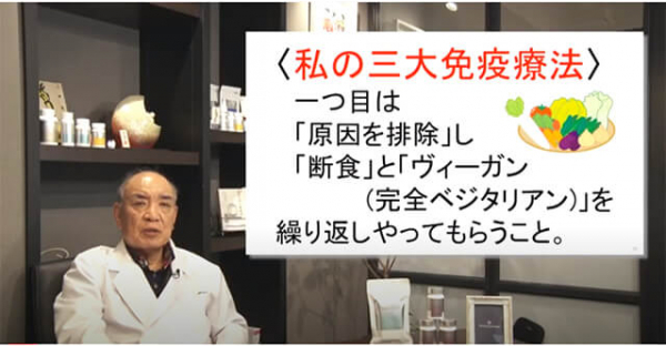 鶴見式三大免疫療法の第一は、「原因の排除」を行い、「断食」と「ヴィーガン」を繰り返す食事療法の指示。