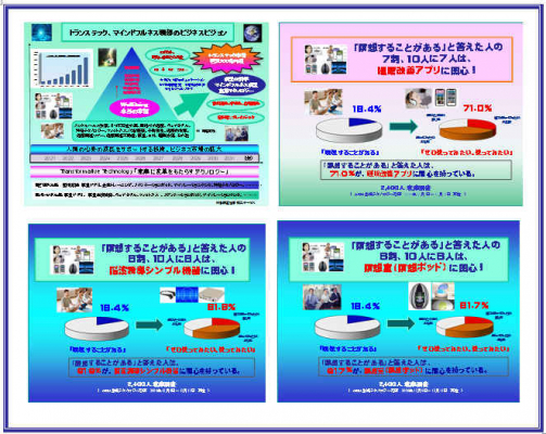 2,400人の意識調査では、「瞑想することがある」と回答した人の71.0%が、睡眠改善アプリに関心を持っている。また、61.9%が、脳波誘導シンプル機器に関心を持っている、また、61.7%が、瞑想室(瞑想ポッド)に関心を持っている、ということが分かった。瞑想アプリサービス、支援機器システムの潜在需要は大きいと考えられる。当調査報告書は内外の市場動向、実際の需要動向調査をふまえ、トランステック、とりわけ、マインドフルネス瞑想関連の市場動向、市場予測、さらに、ビジネス戦略構想についてまとめた。当調査報告書が皆様のビジネス開発、研究開発、製品サービス開発に少しでも寄与できれば幸いである。 AQU先端テクノロジー総研