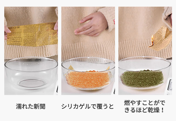 水びたしにした新聞をシリカゲルで覆うと、約10分間置いただけでほぼ元どおり。