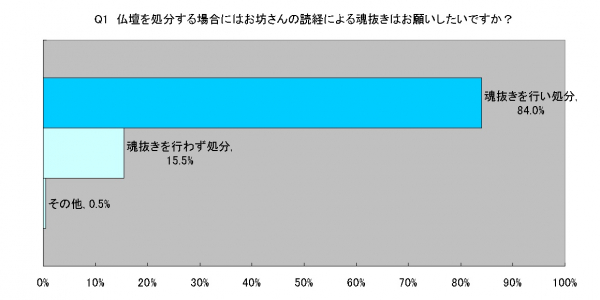 仏壇を処分する場合にはお坊さんの読経による魂抜きはお願いしたいですか?と尋ねてみたところ、「魂抜きを行い処分」(84.0%)、「魂抜きを行わず処分」(15.5%)、「その他」(0.5%)という結果となりました。