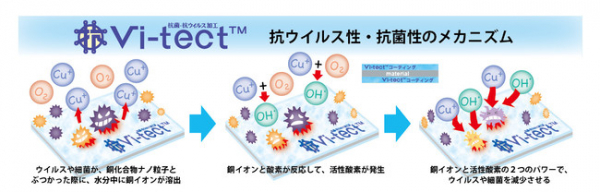 抗ウイルスコート加工「Vi-tectTM 」は、株式会社コスモテクトが開発した製品であり、銅イオンを利用した抗菌・抗ウイルス剤をベースに印刷後加工コートに適する配合と紙や色材に定着するような機能性コーテイング技術(機能性コーティング剤および塗布技術)を確立したものです。