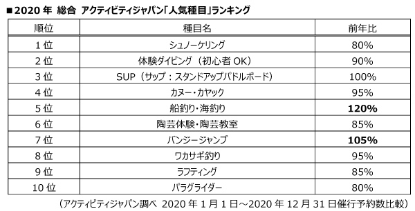 株式会社アクティビティジャパン(本社:東京都新宿区 代表取締役社長:小川雄司、以下アクティビティジャパン)は、2020年12月20日までの予約データを元に、2020年の人気アクティビティ「総まとめ」をランキング形式で発表いたします。