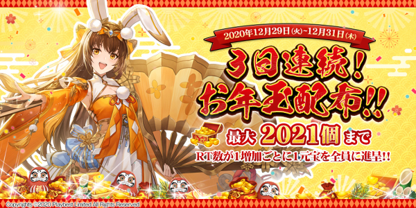 対象のキャンペーンツイートのリツイート数に応じて、1リツイートにつき元宝を1個、最大2021個の元宝を全てのユーザーの皆様に毎日プレゼントいたします。