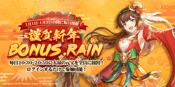 2020年1月1日(金)〜1月3日(日)の間にゲーム内で「Bonus Rain」イベントを開催いたします。イベント開催期間中の20:30〜20:50にログインすると、画面上部からランダムに落ちてくる「ポチ袋」をタップすることで大量の元宝を入手することができます。