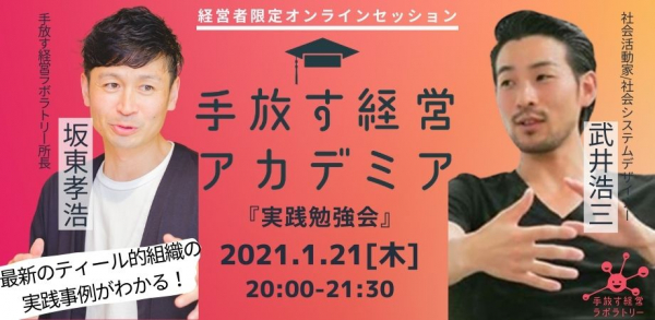 最先端の組織や経営スタイルの研究と組織のアップデート支援を手がける手放す経営ラボラトリー(運営会社株式会社ブレスカンパニー)は、手放す経営アカデミア「実践勉強会」を令和3年1月21日20時からオンラインで無料開催します。