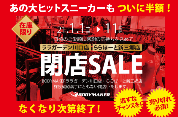 皆様に愛され続けてまいりましたボディメーカーララガーデン川口店・ららぽーと新三郷店が、施設契約満了にともない閉店の運びとなりました。すでに12月18日より閉店セール第1弾がスタート!好評セール中です。そして2021年1月1日よりセール第2弾(1月11日まで)がスタートする。さらにお得な価格でラスト11日間を突き抜ける。感謝・感激 永らくのご愛顧ありがとうございました。ぜひ、ご来店ください。