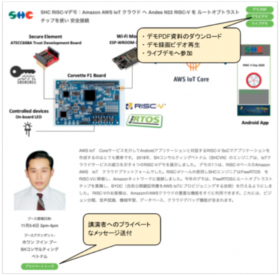 バーチャル・デモブース: バーチャル・デモブースは、RISC-Vの商業活動を封鎖期間中も推進するために、物理会議での要素であった潜在顧客とサプライヤ間の個別会話をオンラインで可能にします。デモ実施者は、自社ビデオ会議プラットフォームを使い、自社オフィスあるいは自社開発拠点から、カメラ、マイクロフォンを使い遠隔で実機デモを実施します。RISC-V Days Tokyo 2020のバーチャル・デモブース用ポータルサイトを提供し、デモ実施者へ参加者を誘導します。仮想デモブースは2つのビジネス機会を提供します。1つはデモをインタアクティブに実施する方法とオープンQ&Aの機会。もう1つは、プライベートに潜在顧客との会話するチャンスです。仮想デモブースポータルサイトを主催者側が作成し、デモとデモブースの運営は各社に委ねられています。下図に、仮想想デモブースのポータルページの例を示します。