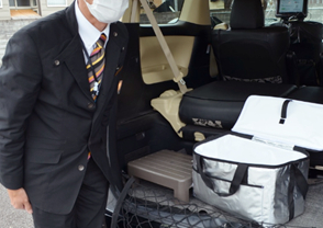 タクシーを使用したフードデリバリーサービスです。お客様が対応店舗でご注文すると店舗から配車依頼が入り、MKタクシーが商品を受け取り、お客様宅へお届けします。到着時にお客様に連絡、タクシーの停車場所まで受け取りにきていただきます。ウイルス対策として、事前決済かQRコード決済のみで現金の授受はせず、商品もトランクからお客様が直接ピックアップ。ドライバーは商品に触れません。2020年12月現在、京都で導入店舗は180軒、京都市内基本料金550円、今後より一層のサービス拡大を予定しています。