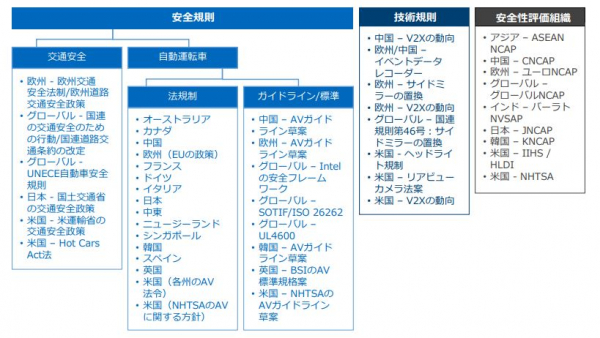 安全規則:ADAS、アクティブセーフティ、自動運転車に関連する世界各国の政府による規制の準備、法整備、ガイドライン、および政策的枠組みに関する最新情報を掲載。