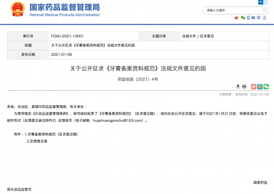 2021年1月6日国家薬品監督管理局より、「歯磨き製品に関する備案申請の実務規定(意見募集稿)」が公表されたことに伴い、WWIPは1月中の翻訳文販売開始を決定しました。(WWIP)