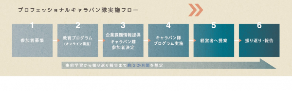 プロフェッショナル・キャラバン隊は、中小企業支援に関心のある大企業人材・OBOG人材がキャラバン隊を結成して中小企業を訪問。「販路開拓」「新規事業開発」「組織活性化」などの課題に解決策を提案します。受け入れ中小企業は、本キャラバンと通して、大企業人材の提案を通して経営課題への取り組みへのヒントを得られると同時に、外部専門人材として大企業人材の受け入れを体験できます。