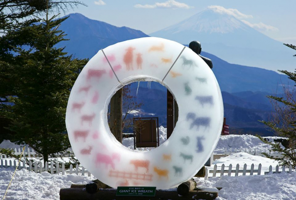 直径は約2.4m、重さは約800kgという国内最大級の氷のリースです。標高1,400mに位置し、最低気温は−15℃にも達する清泉寮の冬の寒さを利用して、2週間ほどかけて少しずつ凍らせて作成しています。巨大リースの正面に立つと、その向こうにポール・ラッシュ像と富士山を望むことができ、記念撮影に最適です。リースの中の図柄は、冬景色の中にも華やかさを感じてほしいと、スタッフがデザインしました。日光などで少しずつ解けていくため、新しい図柄の物と交換しながら公開を続けます。替えが作成できないほど暖かくなり、本体も解けてしまうと公開終了となります。例年は2月下旬頃まで展示しています。