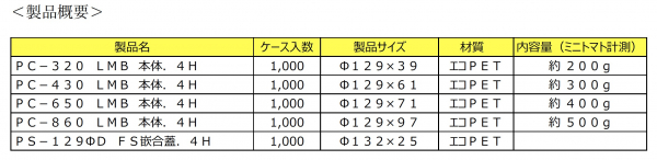 この「PC−LMBシリーズ」に「430LMB」を新発売したことで、サイズバリエーションとしては4型、ミニトマトで比較すると200g〜500gまでと少量パックから大容量パックまで幅広く対応が可能になりました。