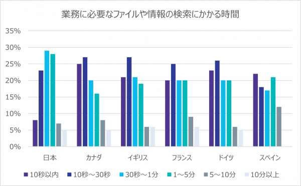 業務に必要なファイルや情報の検索にかかる時間について、「10秒以内」と答えた割合が8.5%と他の調査国(カナダ25%、欧州22%)と比較してもっとも低く、5人に1人以上(27.9%)が「1~5分かかっている」と回答しました。特にカナダでは「1~5分かかっている」と回答した人の割合が16%と低く、情報へのアクセス速度が日本人オフィスワーカーの生産性に影響していると考えられます。