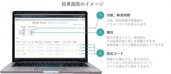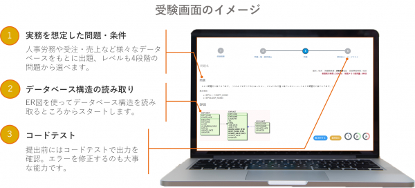 定められた時間内に提示された課題を解決するSQLをコーディングすると、結果はリアルタイムで自動採点される仕組みです。受験はオンラインで実施できるので場所を問いません。