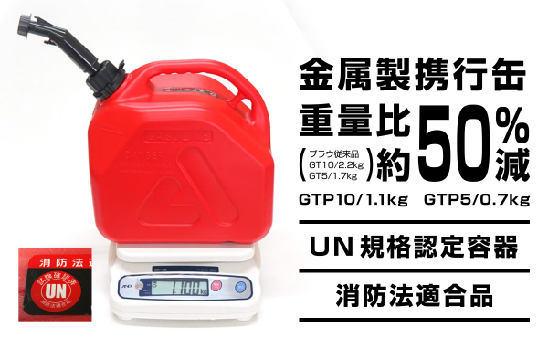 重量はGTP10で1.1kg、GTP5で0.7kgと軽く、どこにでも運び易い便利なプラスチック製ガソリン携行缶。UN規格認定容器/消防法適合品であるためガソリン販売店(ガソリンスタンド)で利用ができ、金属製の携行缶から移し替える手間もなく様々な現場へ向かえます。クルマやバイクへの使用はもちろん、ジェットスキーなどのガソリンを使用するアウトドア用品のお供に、草刈機や耕運機・発電機・チェーンソー・除雪機などの燃料の持ち運びに活躍します。