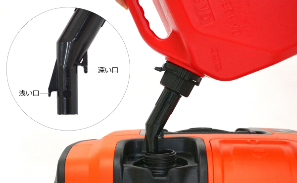 給油タンクに注ぎ口ストッパーを引っ掛け、押し込むと給油スタート。給油終了時はタンクを軽く持ち上げると自動で給油がストップします。