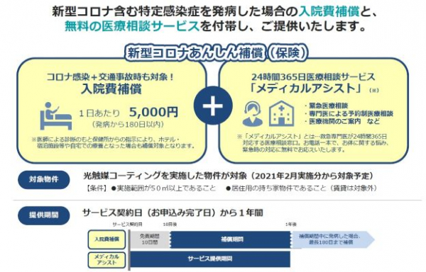 住宅や建物の修繕・改修・維持・管理を手掛けるキャンディルグループの株式会社バーンリペア(代表取締役社長:藤本剛徳、本社:東京都新宿区)と東京海上日動火災保険株式会社(取締役社長:広瀬伸一、本社:東京都千代田区、以下:東京海上日動)は、抗ウイルス抗菌光触媒コーティング(サービス名:「レコナ エアリフレッシュ」)の実施物件にお住まいのご家族全員に、新型コロナ感染症を含む特定感染症を発病した場合の入院費補償(自宅療養含む)と医療相談サービスをサポートする「新型コロナあんしん補償(保険)」の付帯サービスを2021年2月より開始したことを2021年2月15日にご報告いたします。抗ウイルス抗菌光触媒コーティングの実施物件を対象とした同付帯サービスは、建築業界初となります。