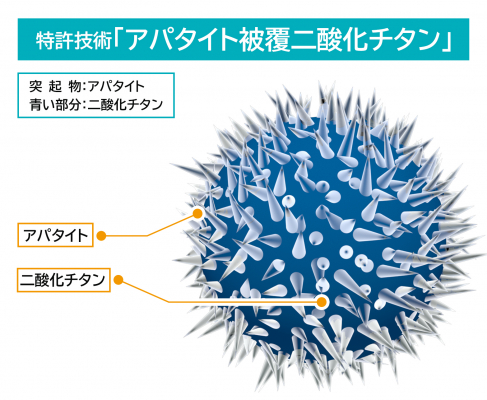 二酸化チタンの表面にアパタイトをコーティングする(=被覆する)ことで、アパタイトの特性である吸着力が大気中に漂っている細菌や有機化合物などを吸着するため、より効率よく細菌や有機化合物を除去できるようになります。