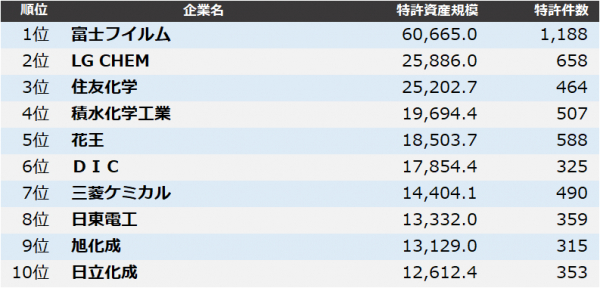 その結果、1位 富士フイルム、2位 LG CHEM、3位 住友化学となりました。