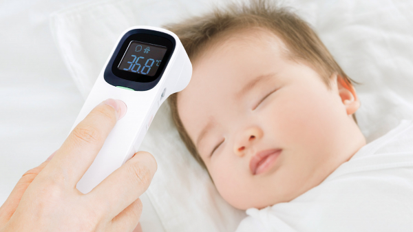 電源を入れ、測定部に向けて測定スイッチを押すと、約1秒で体温が表示されます。動き回るお子様も測定しやすく、忙しい時でもすぐに測定ができるので、毎日の体調管理もしやすくなっています。また、複数人の検温を連続して行う際にも、スムーズに進めることができます。