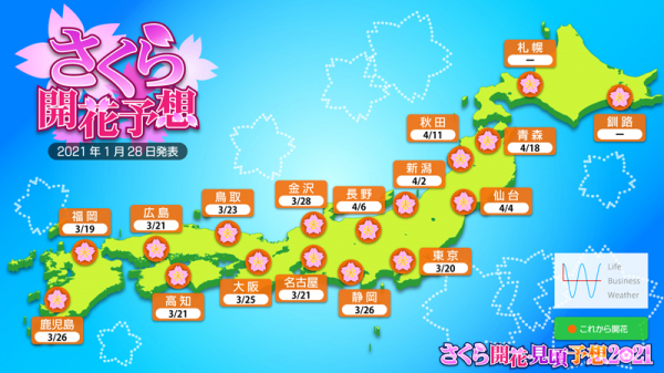 「暮らしに役立てる天気」を提供する株式会社ライフビジネスウェザー(本社:東京都中央区、代表取締役:石川勝敏 以下、LBW)は、2021年1月28日、第1回さくら開花・見頃予想を発表いたしました。