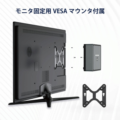 モニターやテレビの裏面に固定できるVESA規格のマウンタが標準付属。本体やケーブルをまとめることで更に省スペース化することが可能です。