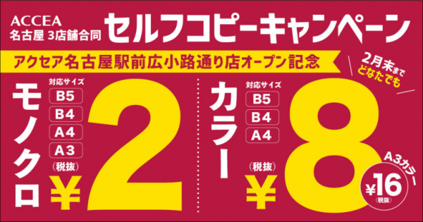 アクセア名古屋駅前広小路通り店のオープンを記念し、アクセア名古屋市内の3店舗合同でセルフコピーキャンペーンを実施いたします。