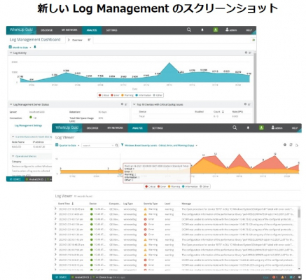 WhatsUp Gold 2021 には、Syslog と Windows ログイベントを追跡し、管理するためのログ管理機能(https://www.ipswitch.com/jp/log-management)が統合されました。ログボリュームの変化などのメタトレンドを監視しながら、WhatsUp Gold の直感的で使いやすいインタフェースを介して、ネットワーク内のすべてのデバイスのログを監視、フィルタリング、検索、および警告通知することができます。WhatsUp Gold のカスタマイズ可能なダッシュボードで、重要な Syslog と Windows ログイベントを、ネットワークの他の部分と同様に統合的に管理できます。