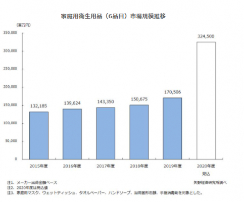 【矢野経済研究所プレスリリース】家庭用衛生用品(6品目)市場に関する調査を実施(2020年)〜2020年度の家庭用衛生用品(6品目)市場規模は前年度比190.3%の3,245億円の見込〜