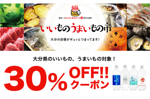「おんせん県おおいた いいもの うまいもの市」は、大分県産のおいしい食べ物やお酒、暮らしに寄り添う工芸品などを集めたWeb物産展です。対象県産品の購入に使える『30%OFFクーポン』が配布されております。