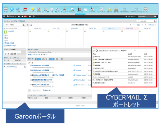 法人向けソフトウェアの開発、販売を行うサイバーソリューションズ株式会社(所在地:東京都港区、代表取締役社長:秋田健太郎、以下当社)は、提供する法人向けクラウド型メールサービス『CYBERMAIL Σ(サイバーメールシグマ)』において、サイボウズ株式会社のクラウド基盤『cybozu.com』との連携をさらに強化します。具体的には、『cybozu.com』のグループウェアサービスであるクラウド版『Garoon(ガルーン)』のポータル画面上で『CYBERMAIL Σ』のメールボックス情報を表示できる『ポートレット連携』機能を、2月10日より新たに提供することをお知らせいたします。