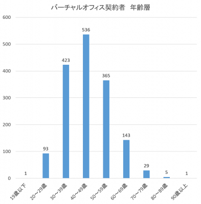 【年齢層・バーチャルオフィス】19歳以下:1名、20〜29歳:93名、30〜39歳:423名、40〜49歳:536名、50〜59歳:365名、60〜69歳:143名、70〜79歳:29名、80〜89歳:5名、90歳以上:1名