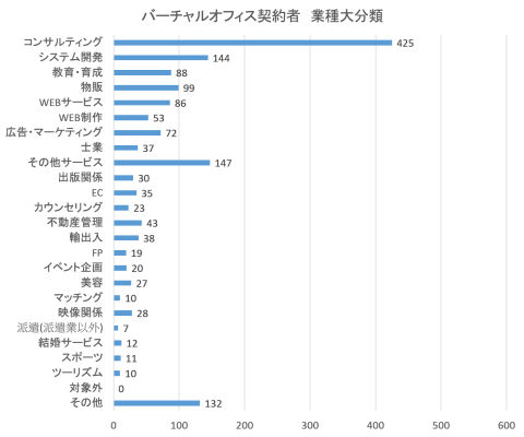 【業種・バーチャルオフィス】コンサルティング:425名、システム開発:144名、教育・育成:88名、物販:99名、WEBサービス:86名、WEB制作:53名、広告・マーケティング:72名、士業:37名、その他サービス:147名、出版関係:30名、不動産管理:43名、カウンセリング:23名、EC:35名、輸出入:38名、FP:19名、美容:27名、イベント企画:20名、マッチング:10名、映像関係:28名、派遣(派遣業以外):7名、結婚サービス:12名、スポーツ:11名、ツーリズム:10名、対象外:0名、その他:132名