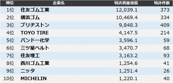 【ゴム製品】特許資産規模ランキング2020 トップ3は住友ゴム、横浜ゴム、ブリヂストン