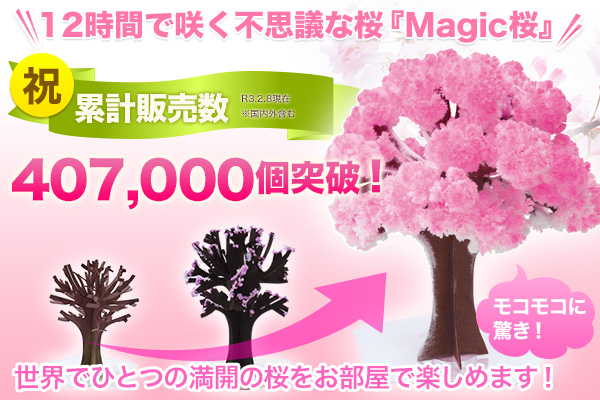 株式会社OTOGINO(オトギノ:代表取締役社長 鬼武公洋 本社 大分県日田市北友田 2 丁目 2123 番地 1)がE-コマースにて販売中の12時間で咲く不思議な桜『マジック桜』が、シリーズ累計販売数407,000個を突破しました。(2021/2/8現在、国内外含む)