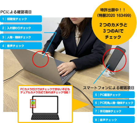 「リモートWebテスト」とは、“AI”による本人認識や動作・物体解析と“デュアルカメラ方式”による人物・物体確認を実現した、自宅や職場で受験可能なWeb試験方式です。PCカメラから本人認識や物体解析を行うとともに、PCカメラの死角となるパソコンの表示画面や背景などをスマートフォンカメラにてダブルチェックすることで、なりすましやカンニング等の不正行為を抑制した公正・公平なWeb試験を実現しています。