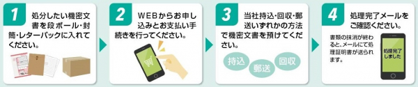 「在宅勤務を始めて、印刷する書類が増えた」「不要な文書を家庭ごみと一緒に捨てることに抵抗がある」「文書の保管スペースがなく、こまめに処分したい」という在宅勤務者はもちろん、「家に捨てきれないはがきや手紙がたくさんあり困っている」「古い通帳や公共料金の支払い票などの処分方法がわからず、貯めこんでいる」という方まで、安心・安全に処分することが可能です。