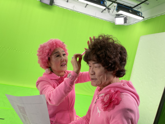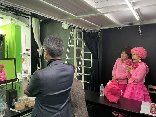 撮影中は、パー子さんにペーさんが「最初からそんなに出していると声出なくなるよ」と声をかけるとパー子さんが「お腹から声出しているから大丈夫」と。パー子さんは、最初から最後まで同じ音量で笑っていらっしゃいました。また、普段着の中に撮影用の衣装(全て自前)を着込んでスタジオに来られたのですが、普段着もピンクなのでピンクのズボンの下からピンクのズボンが出ているというお茶目な姿に。ペーさんご本人の記憶によると帽子をかぶったCM撮影は初めてのことらしいですが芸歴の長い方ですから真偽は不明です。