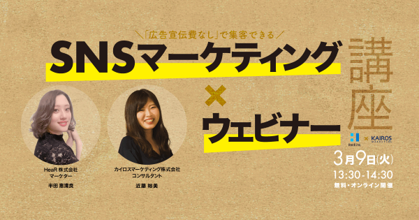 マーケティングオートメーション「Kairos3」を提供するカイロスマーケティング株式会社(本社:東京都渋谷区、代表取締役:佐宗 大介、以下「カイロスマーケティング」)は、2月に実施したHeaR株式会社(本社:東京都品川区、代表取締役:大上 諒、以下「HeaR」)との共催セミナー「SNSマーケティング×ウェビナー講座」に100名以上が参加し、好評だったことを受け、3月9日(火)に追加開催することを決定いたしました。