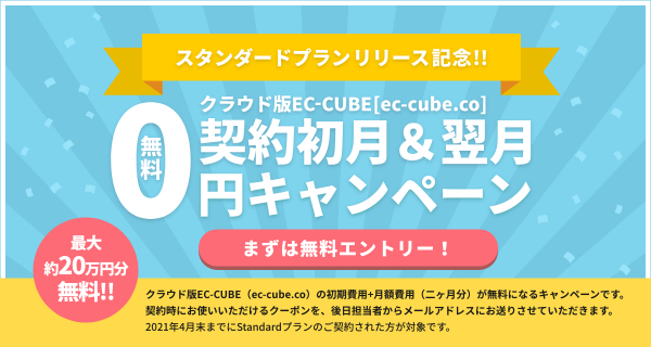 株式会社イーシーキューブ(本社:大阪府大阪市北区 代表取締役社長:金 陽信 以下、当社)はEC-CUBEのクラウド版「ec-cube.co」における新プラン「スタンダードプラン」のリリースを記念して、2021年4月30日までの契約者を対象に、契約初月と翌月におけるシステム利用料(初期費用と月額費用)が無料となるキャンペーンを2021年3月1日より開始することを発表いたします。